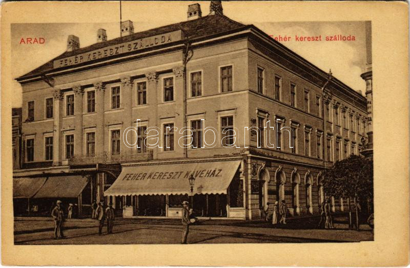 Arad, Fehér Kereszt szálloda és kávéház / hotel and cafe https://www.darabanth.com/hu/459-Gyorsarveres/459.0/Kepeslapok/Erdely~1500006/Arad-Feher-Kereszt-szalloda-es-kavehaz-hotel-and-cafe~II3073934