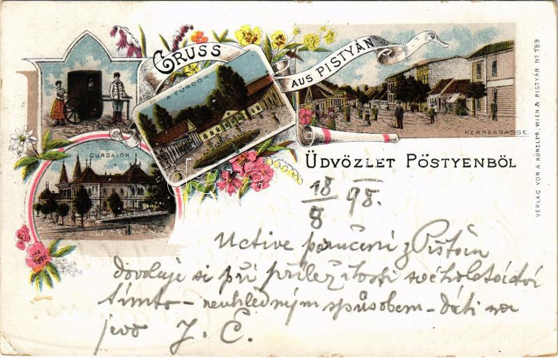 Leírás: 1898 (Vorläufer) Pöstyén, Pistyán, Piestany; Cursalon, Herrengasse, Infanterist / Úri utca, fürdők, fürdőkocsis / street, spa, carriage. A. Künzler Art Nouveau, floral, litho (EK)