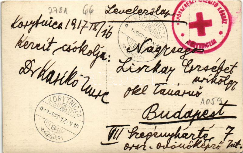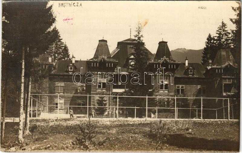 Leírás: 1917 Koritnyica, Korytnica; Hygiea gyógyház, fürdő szálloda, K.u.K. katonák / WWI K.u.K. military, soldiers, field hospital, villa, spa. photo + "Vöröskereszt kisegítő kórház Korytniczán" (EK)