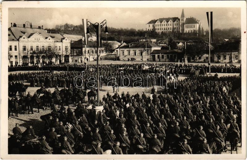 1938 Léva, Levice; bevonulás, tábori mise a Kossuth téren, Országzászló. Foto Hajdu / entry of the Hungarian troops, field mass, Hungarian flag (ragasztónyom / gluemark)