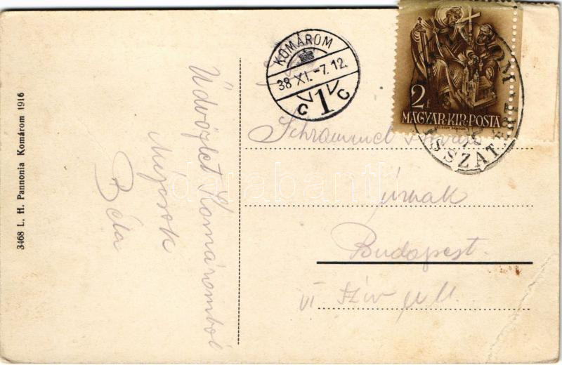 Komárom, Komárno; A cs. és kir. 13. utász zászlóalj hídverése, a hadihíd építése / Bau einer Kriegsbrücke / WWI K.u.K. military pioneers building a war bridge, pontoon bridge + "1938 Komárom visszatért" So. Stpl. (EB)