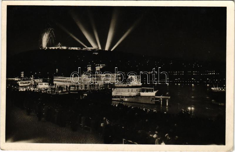 Leírás: 1938 Budapest, XXXIV. Nemzetközi Eucharisztikus Kongresszus, esti hajófelvonulás a Dunán (EK)