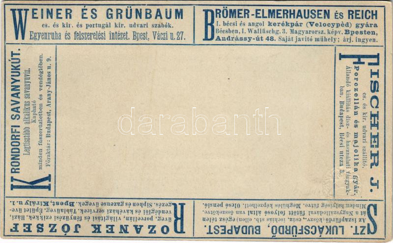 Hirdetményes levelezőlap egy krajcárért kapható! Szent Lukácsfürdő, Rozanek József üvegező, Krondorfi savanyúkút, Fischer J. cs. és kir. udvari szállító, Brömer-Elmerhausen és Reich I. bécsi és angol kerékpár (Velocypéd) gyára, Weiner és Grünbaum cs. és kir. és portugál kir. udvari szabók. 2 Kr Ga. / Very early Hungarian advertisement card of factories and shops (fl)