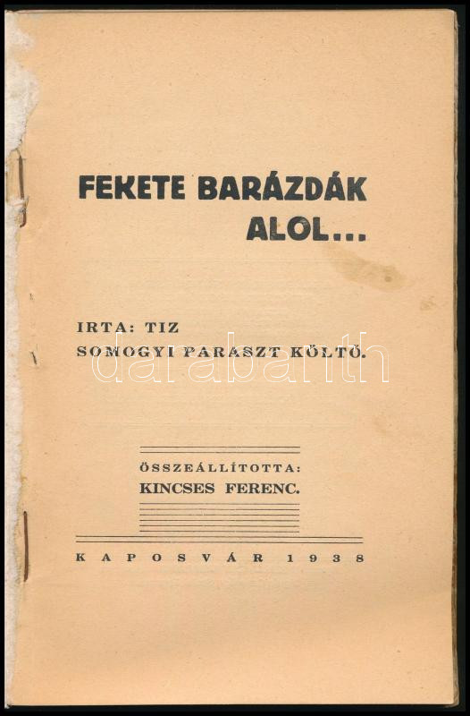 Leírás: Fekete barázdák alól... Írta: Tíz somogyi paraszt költő. Kaposvár, 1938, Kincses Ferenc. Kiadói papírkötés, kötésterv: Soós, kissé kopottas állapotban.
