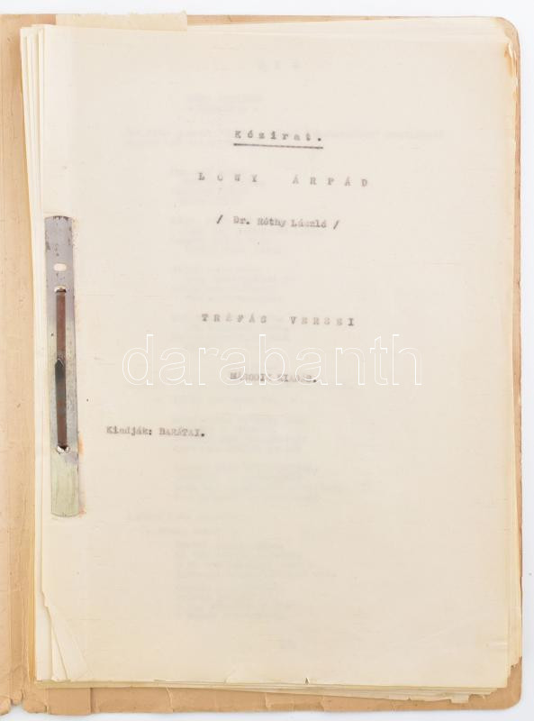 Leírás: Lőwy Árpád (Dr. Réthy László) tréfás versei. Kézirat. Második kiadás. Kiadják: Barátai. H.n., é.n., 66 p. Lefűzve, sérült papírmappában, helyenként kissé sérült lapszélekkel.