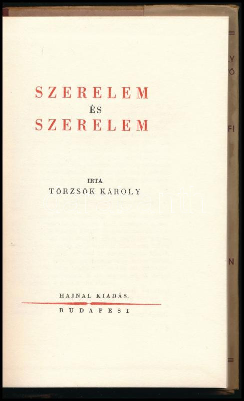 Törzsök Károly: Szerelem és szerelem. (DEDIKÁLT). Bp., [1944], Hajnal (Hollósy János-ny.), 121+(7) p. + 6 (fekete-fehér képek) t. Kiadói félvászon-kötés, jó állapotban, kiadói papír védőborítóban. A szerző, Törzsök Károly (1906-1964) szobrászművész, Kisfaludi Strobl Zsigmond tanítványa által DEDIKÁLT példány.