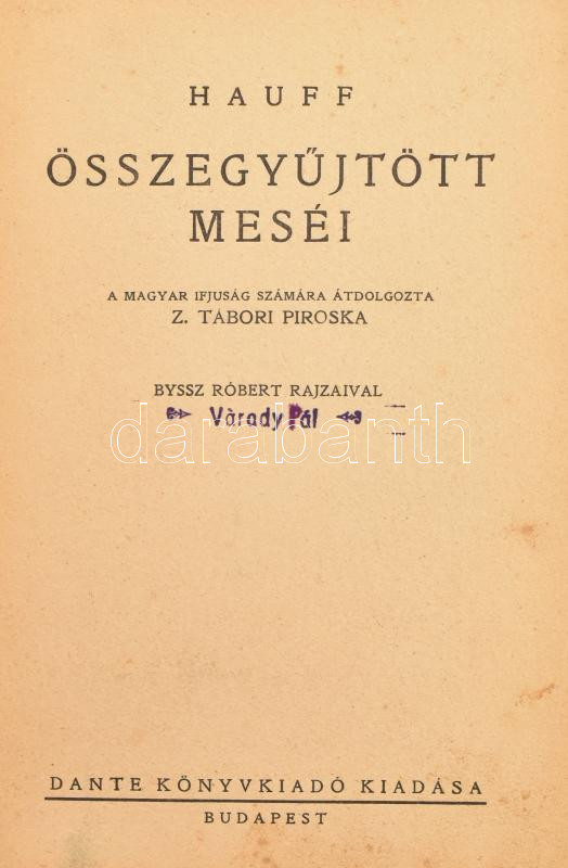 [Hauff, Wilhelm]: Hauff összegyűjtött meséi.; A nagyorrú törpe és más mesék. A magyar ifjúság számára átdolgozta: Z. Tábori Piroska. Bp.,[1930],Dante, 86+2+80 p. Gazdag fekete-fehér képanyaggal illusztrált. Az illusztrációk Byssz Róbert (1893-1961) munkái. Kiadói félvászon-kötés, kopott, foltos borÃtóval.