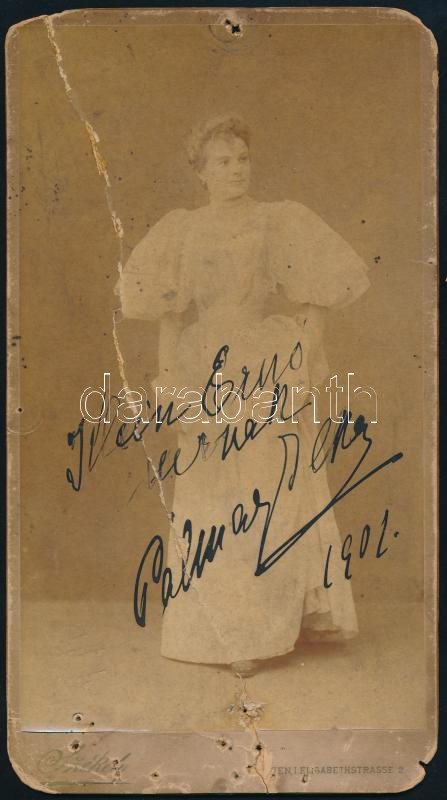1901 gróf wchinitzi és tettaui Kinszky Jenőné Pálmay Ilka (1859-1945) színésznő portréja, autográf aláírásával és dedikációjával, keményhátú fotó Dr. Székely bécsi műterméből, töréssel, rajzszög ütötte sérülésekkel, 20,5×11,5 cm