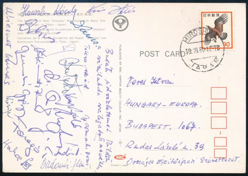 Leírás: 1980 A magyar férfi vízilabda-válogatott tagjainak aláírásai Japánból hazaküldött képeslapon: Hauszler Károly, Gyarmati Dezső, Wiesner Tamás, Budavári Imre, Faragó Tamás, stb.