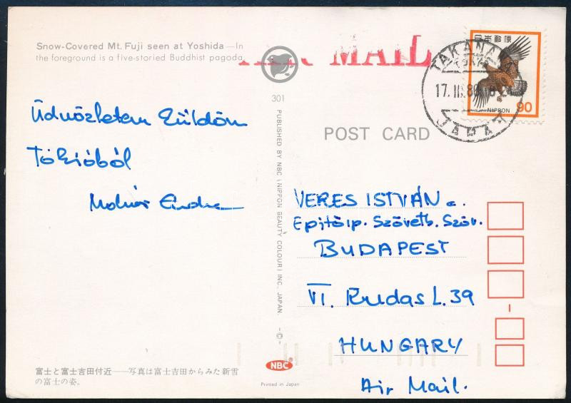Leírás: 1980 Molnár Endre (1945- ) olimpiai bajnok vízilabdázó, edző autográf aláírása és sorai Tokióból hazaküldött képeslapon
