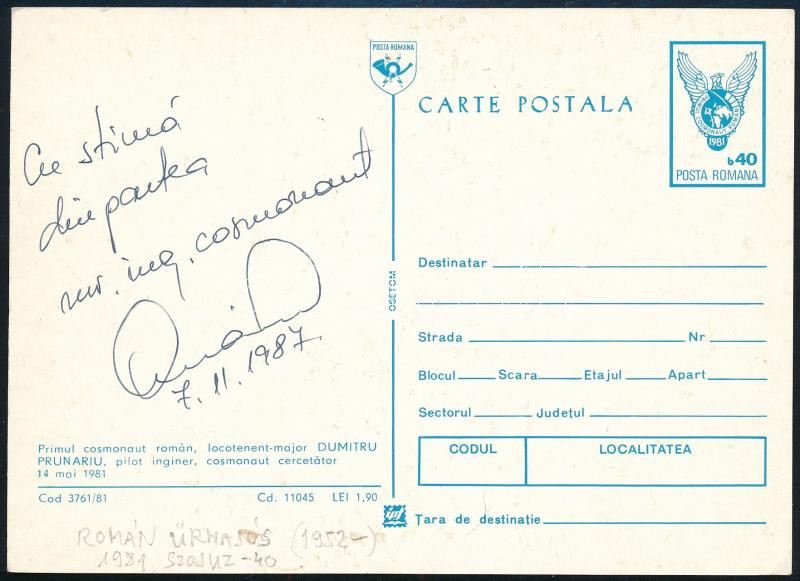 Leírás: Dumitru Prunariu (1952-) román űrhajós aláírása az őt ábrázoló képeslapon