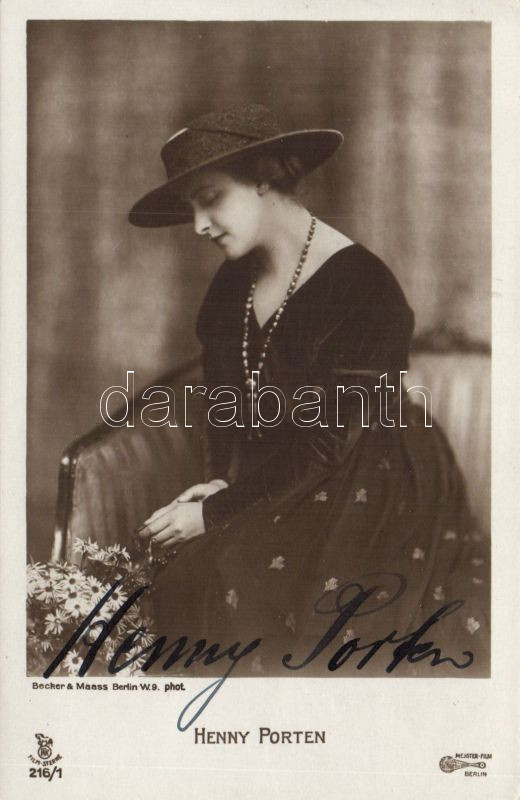 Frieda Ulricke "Henny" Porten (1890-1960) a néma korszak német színésznője és filmproducere, Németország első jelentős filmsztárja volt. 1906 és 1955 között több mint 170 filmben szerepelt. autográf aláírással ellátott fotólap / German actress photo with original signature