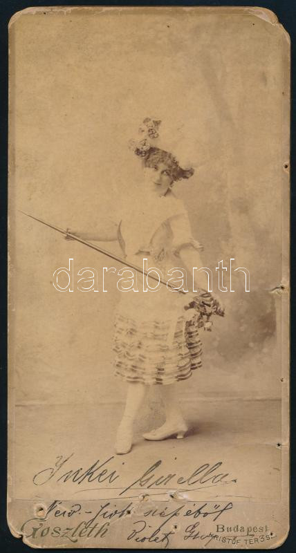 cca 1895-1900 Inkey (Inkei) Gizella színésznő portréja sajátkezű aláírásával és dedikációjával, keményhátú fotó Goszleth István budapesti műterméből, rajzszög ütötte sérülésekkel, 21×11 cm. Inkey (Inkei) Gizella többek közt az aradi és kolozsvári színházak primadonnája volt.