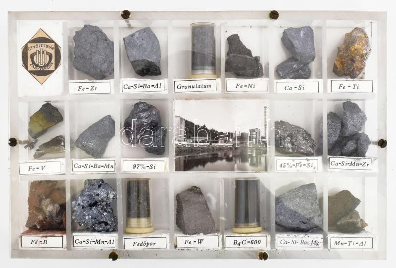 Leírás: cca 1950/60, Ötvözetgyár Zagyvaróna Salgótarján, a bányászott ásványokat bemutató mintakollekció, műanyag tartóban, 25x16,5 cm