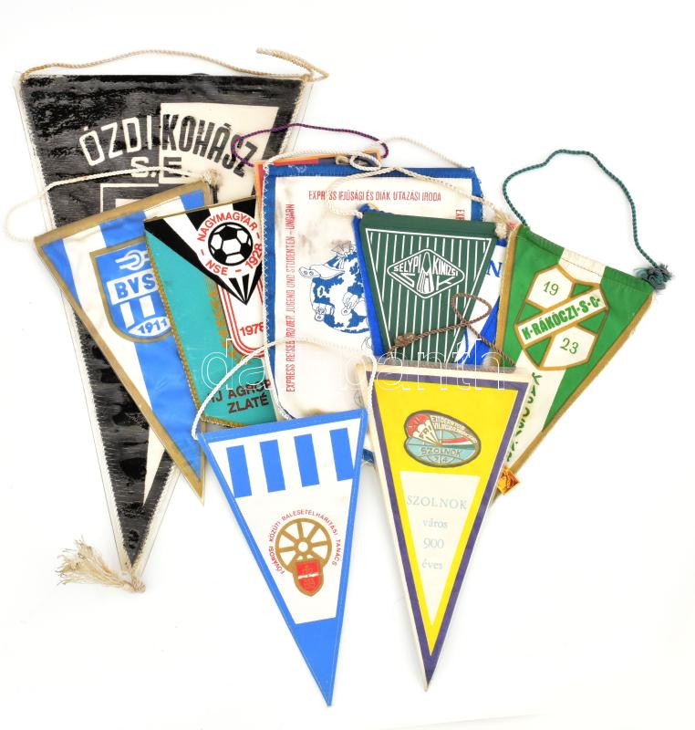 Leírás: 11 darab asztali zászló, zömmel sport, közte Ózdi Kohász, BVSC, Nagymagyar NSE, Vasas izzó, Debrecen, Kaposvár, klf méretben