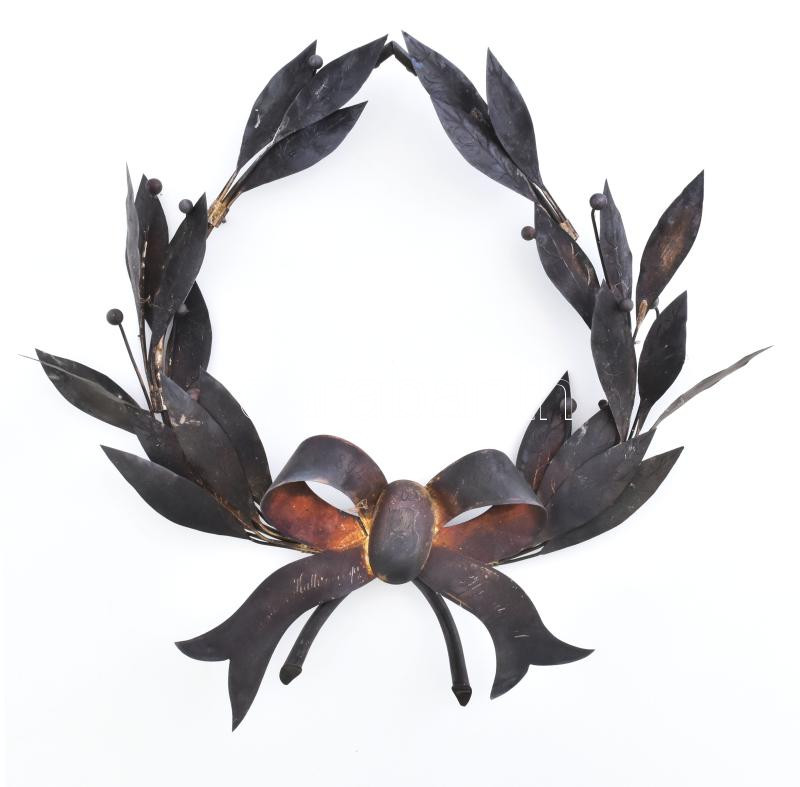 Leírás: 1904 Az Országos Középponti Katolikus Legényegyesület ajándéka Dr. PJ-nek. Babérkoszorú alakú rézlemez, vázra erősítve, cca 31x30 cm
