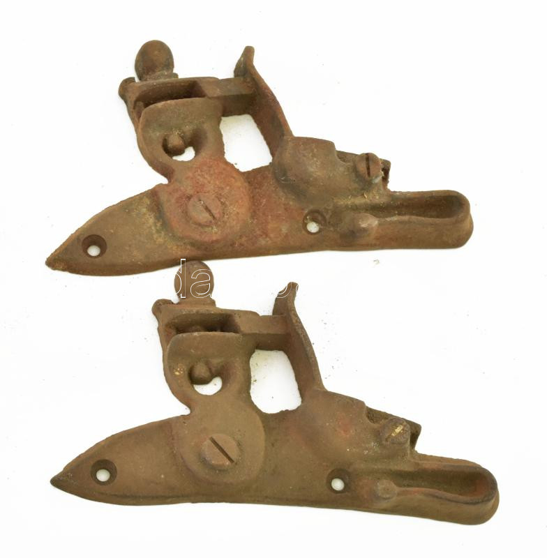 Leírás: 2 darab egybeöntött kovás puska szerkezet, replika fegyverekhez, h: 14-15 cm