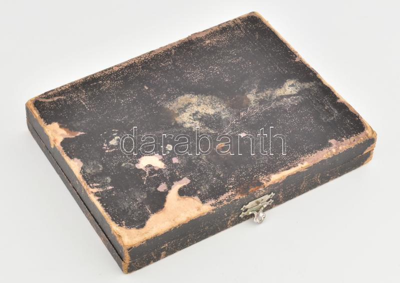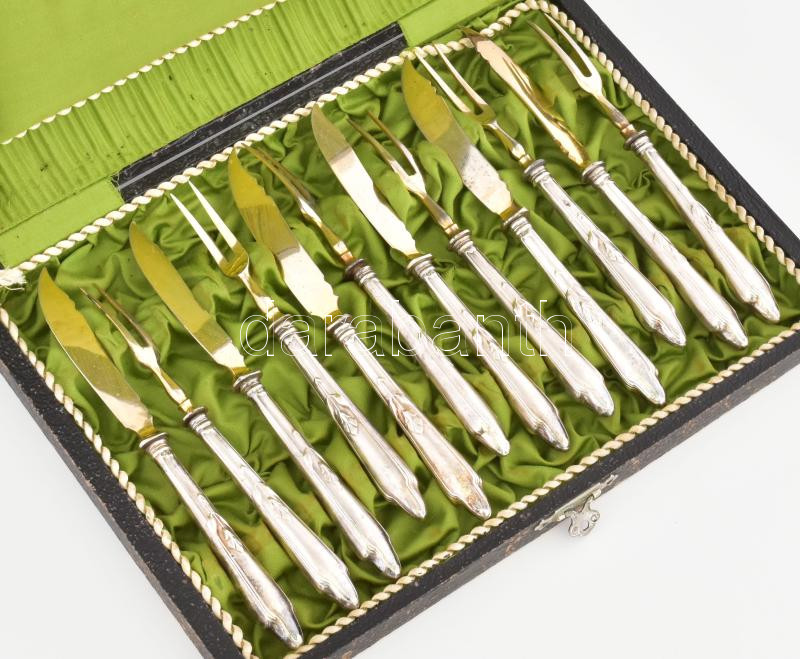 Leírás: Antik 6 személyes halvilla és halkés készlet, jelzett (A.W.), kopott díszdobozban, h: 14-15 cm