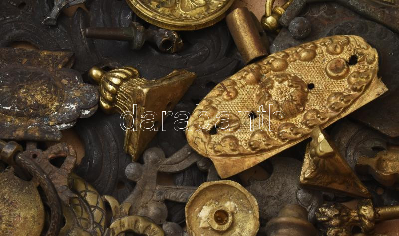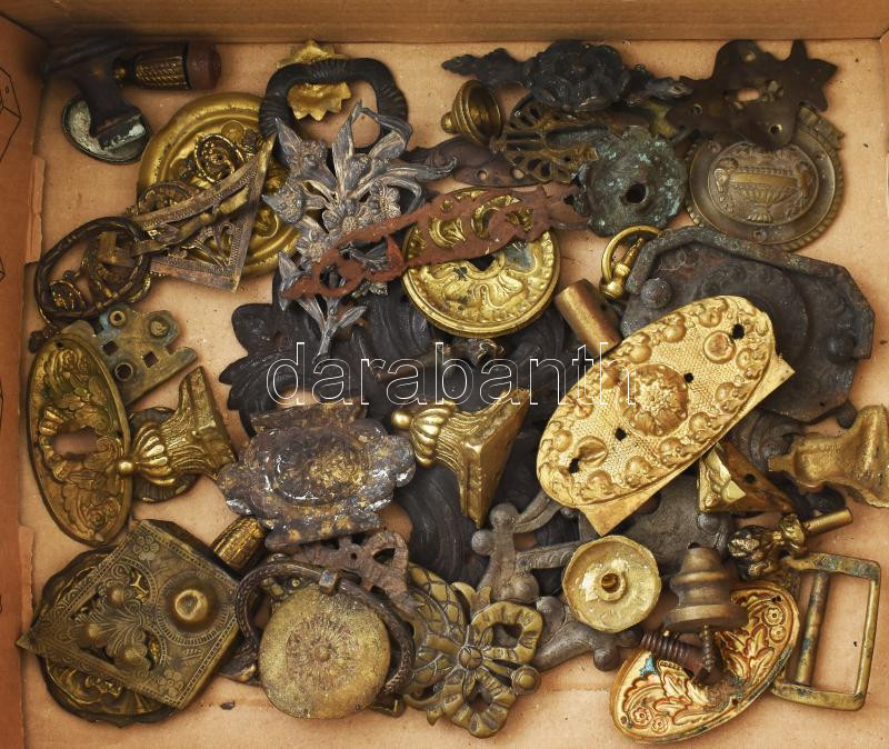 Leírás: Doboznyi sokdarabos antik bútorveret tétel, értékes darabokkal, réz, bronz, fém, klf méretben és állapotban