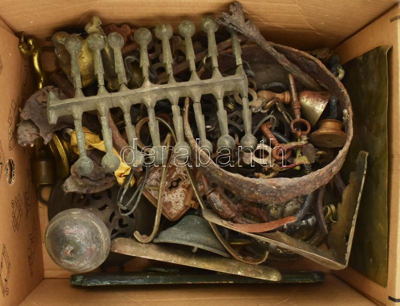 Leírás: Doboznyi sokdarabos antik fém tárgy tétel, közte érdekes és értékes darabokkal, vegyes állapotban és méretben