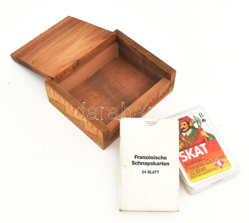 Leírás: Faragott fa doboz, 2 pakli kártyával