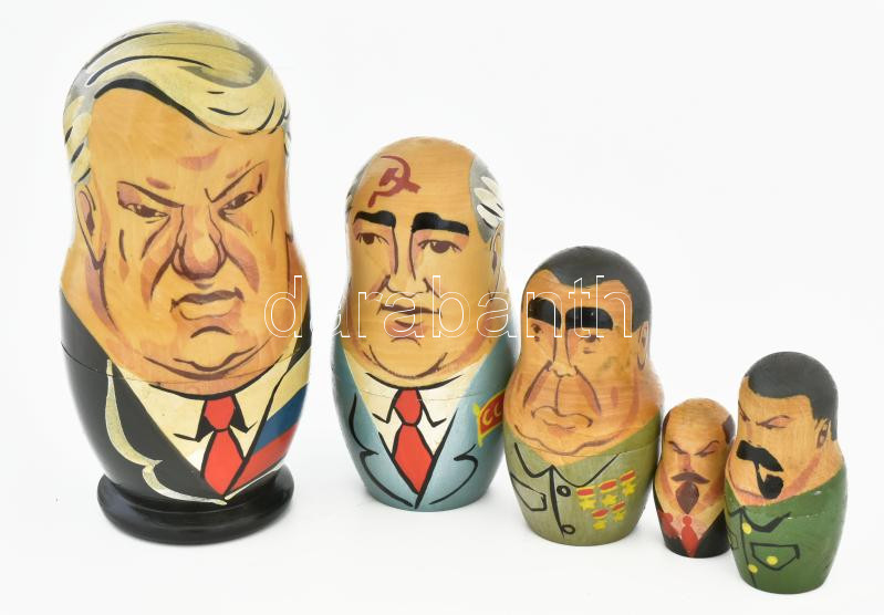 Jelcin, Gorbacsov, Brezsnyev, Sztálin, Lenin, stb. festett fa matrjosk... https://www.darabanth.com/hu/459-Gyorsarveres/459.0/Mutargy-papirregiseg-egyeb/Bolhapiac~1000014/Jelcin-Gorbacsov-Brezsnyev-Sztalin-Lenin-stb-festett-fa-matrjoska-babak-5-18-cm-ig~II3070296