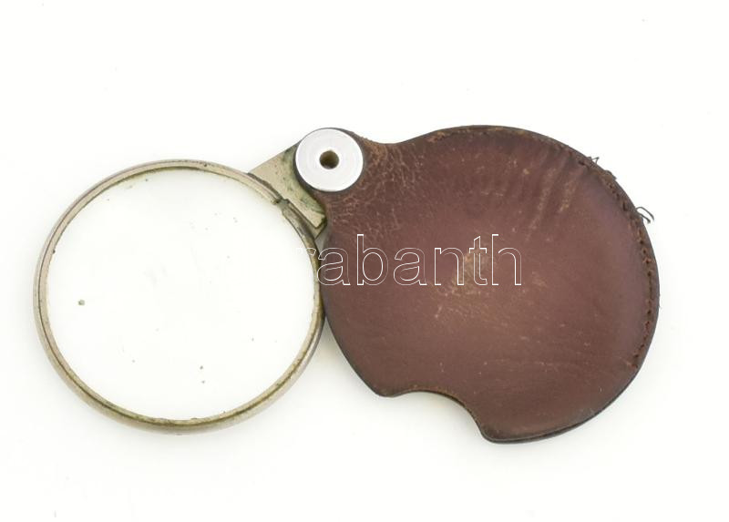 Leírás: Régi zsebnagyító, bőr tokkal, kissé kopott, tokon a varrás részben szétvált, d: 49 mm