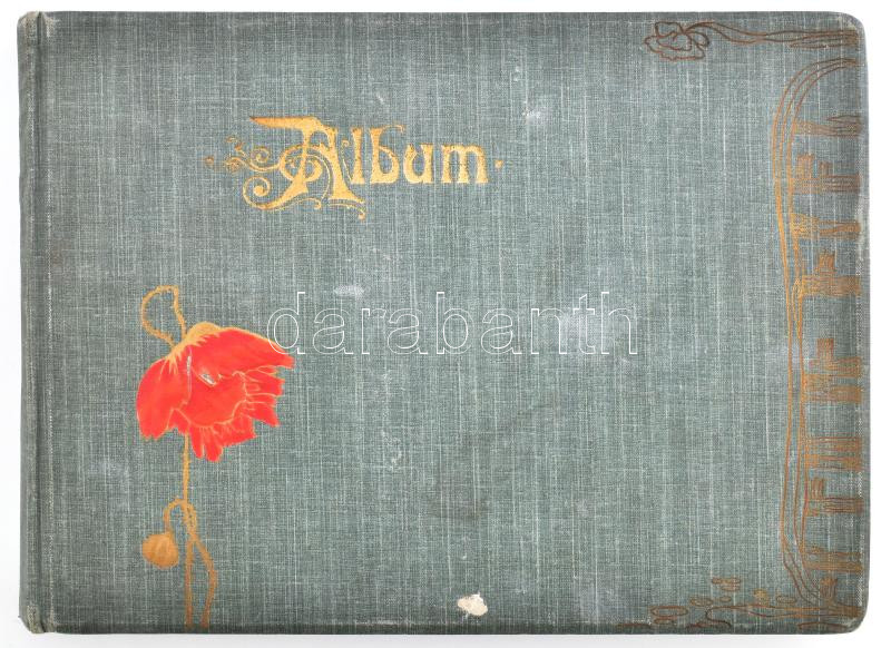 Leírás: Szecessziós egészvászon-kötésű fotóalbum, kissé kopott, foltos borítóval, belül jó állapotban, 24,5x18 cm
