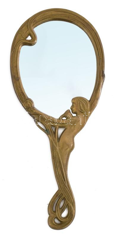Leírás: Szecessziós stílusú réz kézitükör, h: 25 cm
