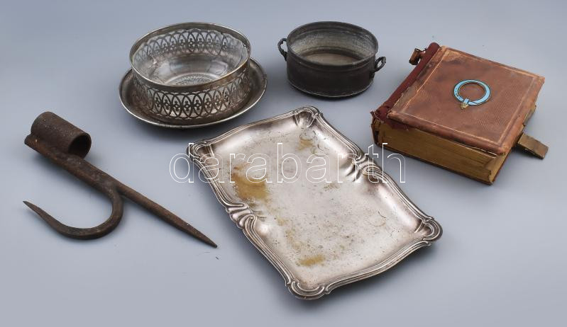 Leírás: cca XIX. sz. vége, 5 darab antik tárgy egyben, közte szecessziós ezüstözött tálca, sérült fotóalbum, réz fazék, vegyes méretben és állapotban