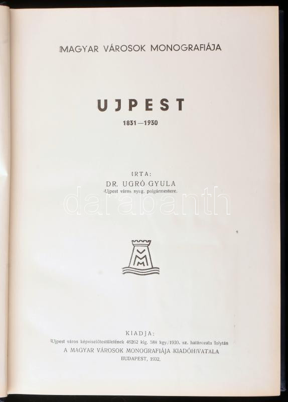 Dr. Ugró Gyula: Újpest. 1831-1930. Sajtó alá rendezte: Dr. Ladányi Miksa. Magyar Városok Monográfiája XI. Bp.,1932, Magyar Városok Monográfiája, 532 p.+9 t. Fekete-fehér fotókkal illusztrálva. Kiadói aranyozott dombornyomott egészvászon-kötés, festett felső lapélekkel, jó állapotban.