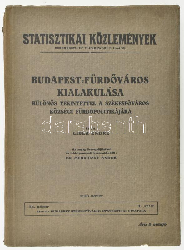Liber Endre: Budapest-fürdőváros kialakulása különös tekintettel a székesfőváros községi fürdőpolitikájára I. köt. Bp., 1934., Budapest Székesfőváros Házinyomdája. Kiadói papírkötés, gerincen kis sérüléssel 402p.