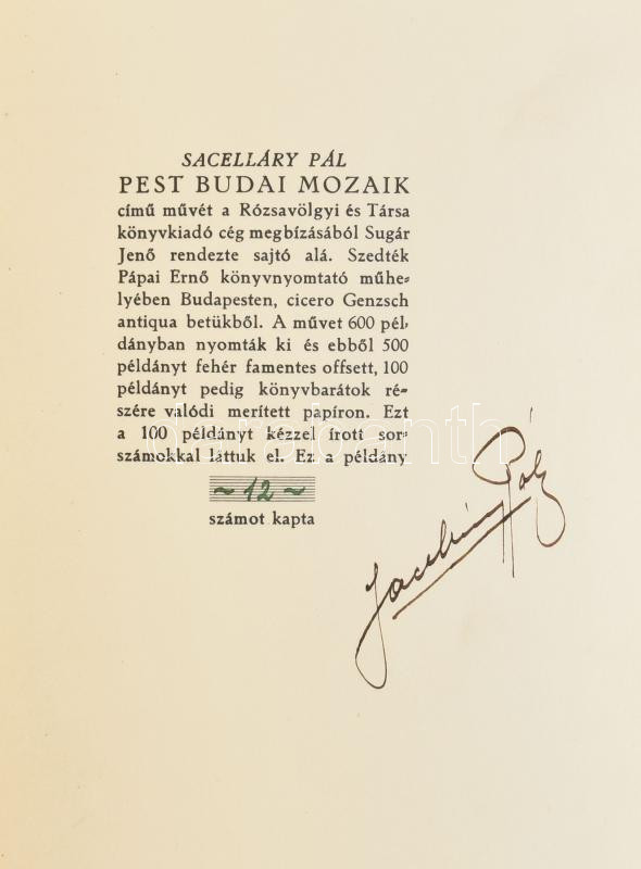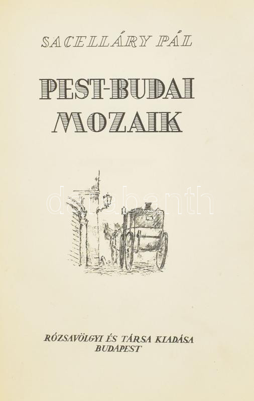 Sacelláry Pál: Pest-Budai Mozaik. Rajzok a szabadságharc előtti évek Pestjének társadalmi életéből. Bárczy István előszavával. Bp.,[1933], Rózsavölgyi és Társa, 82 p. Kiadói félvászon kötés, minimális kopással. Megjelent 600 példányban. Számozott (12/600) és ALÁÍRT példány!