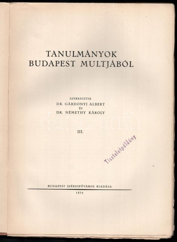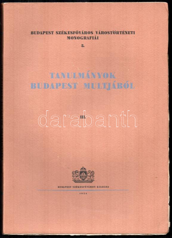 Tanulmányok Budapest multjából III. Szerk.: Gárdonyi Albert, Némethy Károly. Budapest Székesfőváros Várostörténeti Monográfiái 5. Bp., 1934, Budapest Székesfőváros, 10+179 p.+12 t. Kiadói papírkötés.
