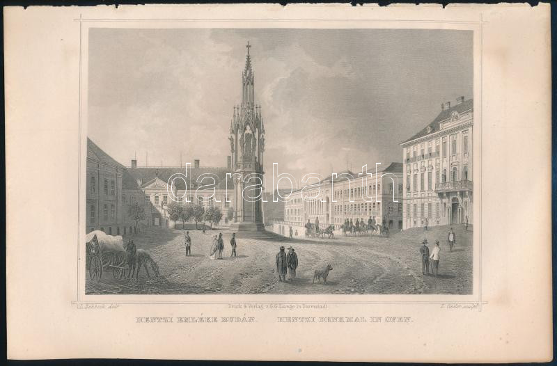 cca 1860 Hentzi emlék Budán. Ludwig Rohbock (1820-1883)-Franz Hablitschek (1824-1867), Pest, Lauffer és Stolp, acélmetszet, jelzett a dúcon, 13x18 cm, teljes: 16x24 cm