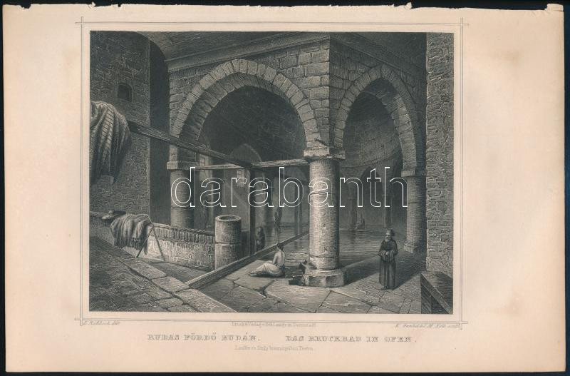 cca 1860 Rudas fürdő Budán. Ludwig Rohbock (1820-1883)-Franz Hablitschek (1824-1867), Pest, Lauffer és Stolp, acélmetszet, jelzett a dúcon, 13x18 cm, teljes: 16x24 cm
