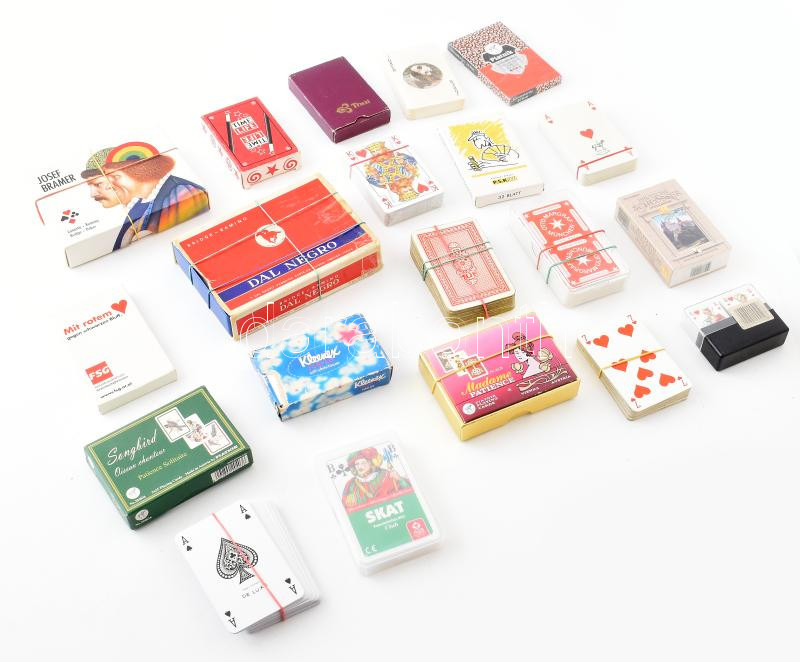 Leírás: 20 pakli kártya, közte bontatlan Piatnik magyar kártyákkal és minikártyával.