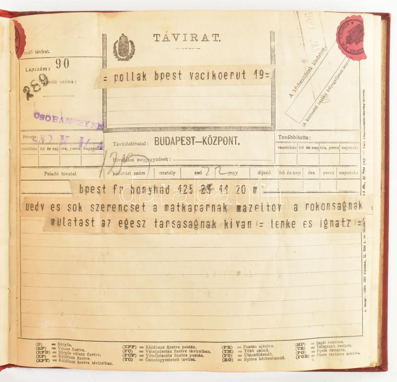 1900 Pollák Sári és Sándornak házasságkötés alkalmából küldött gratuláló táviratok, Pollák Jakab budapesti címére néhány zsidóságra utaló szóval (mazeltov) és egy jiddishez hasonló gratulációval: "mazl und (...) an te ganze mischpoche", közte néhány ismert személyiség: Wack Keresztély (1858-1930), kereskedelmi tanácsos, a Goriup ecetgyár tulajdonosa; Leopold Königstein, Bécs; több távirat Tolnából (Bonyhád, Hőgyész, Gyönk). Korabeli historizáló, aranyozott, kopott egészvászon kötésben