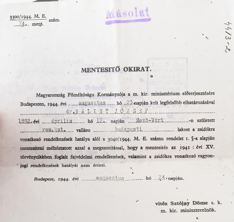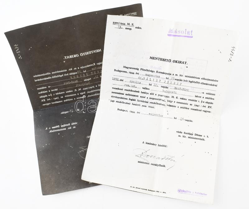 Leírás: 1944 Mentesítő okirat a Sztójay kormánytól és a kormányzótól zsidó személy számára. Korabeli hivatalos fénymásolat 2 db