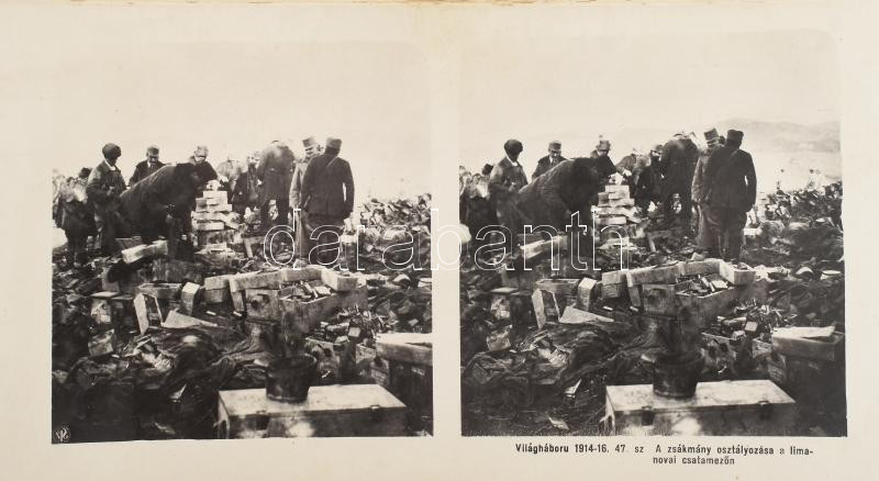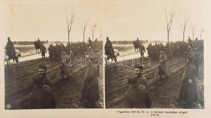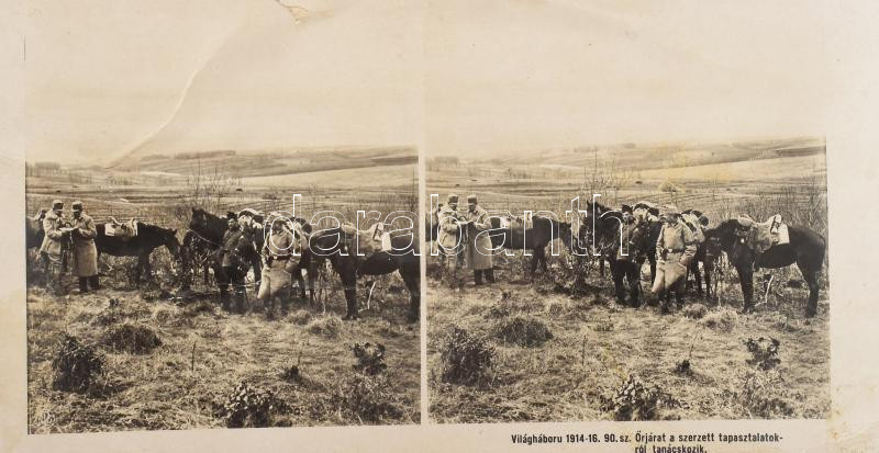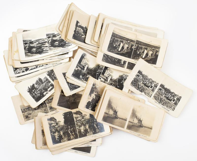 1914-1916 Katonai események sztereófotói az I. világháborúból (pl. 15 cm-es nehéz tarack lőállásban, elesett oroszok eltemetése, telefonfülkék a parancsnok sátra mellett, stb.), 86 db fotó, közte sérültek, 9×18 cm