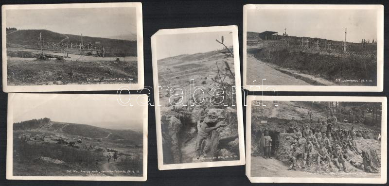 1915 Wał (Lengyelország), I. világháborús képek a keleti frontról: osztrák-magyar katonai alakulat csoportképe, tábor látképe, katonák lövészárokban, katonai temető. 5 db eredeti fotó, vegyes állapotban, 14,5x9 cm / 1915 Wał (Poland), WWI photos from the Eastern Front: Austro-Hungarian soldiers' group photo, camp, soldiers in a trench, military cemetery (graveyard). 5 original photos, mixed condition, 14.5x9 cm