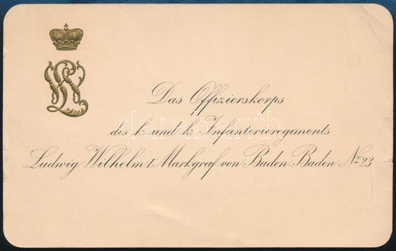1916 Das Offizierskorps des k. und k. Infanterieregiments Ludwig Wilhelm I. Markgraf von Baden-Baden No. 23. / A cs. és kir. 23. "Lajos Vilmos badeni Å‘rgróf" gyalogezred tisztikarának dÃszes, dombornyomott cÃmerrel ellátott üdvözlÅ‘lapja, hátoldalán ceruzás aláÃrásokkal, 17,5x11 cm