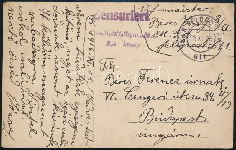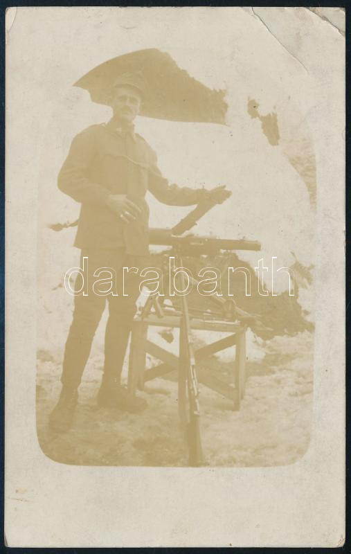 1916 Magyar katona Schwarzlose géppuskával, fotólap, tábori postaként megírva, "Zensuriert - K. u. K. Inft. Rgmt. No. 37 - 5.a komp" bélyegzéssel, sarkán törésnyomokkal, 14x8,5 cm