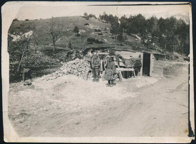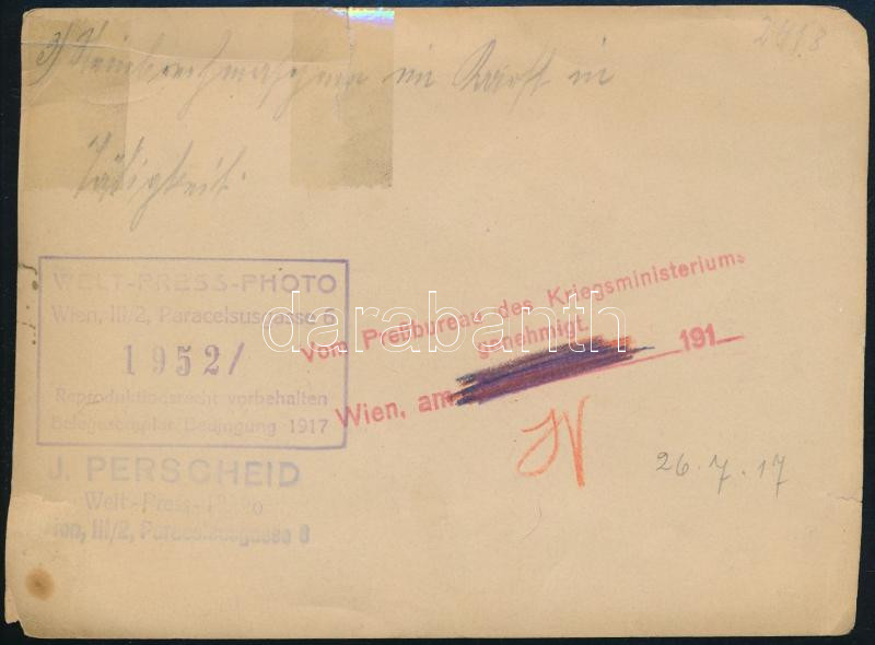 Leírás: 1917 I. világháború, életkép a frontról, osztrák sajtófotó, a hátoldalon feliratozott, pecséttel jelzett, sérült, ragasztott, 16x11,5 cm