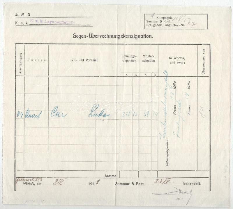 1918 Ellenszámlás küldemény.K.u.k. Lagunenflotille (1916-18 között működő speciális haditengerészeti egység, melynek Trieszt környékének védelme volt a feladata) ritka osztrák-magyar haditegerészeti bélyegzéssel, / 1918 Folded Gegen-überrechgnungskonsignation. rubberstamp seal: