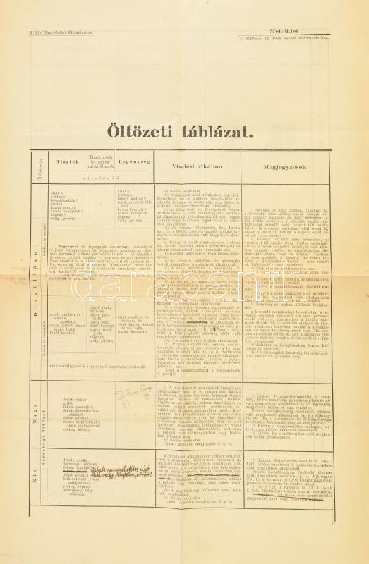 Leírás: 1931 M. Kir. Honvédelmi Minisztérium, Öltözeti táblázat tisztek és legénység részére, kétoldalas, 47x31,5 cm