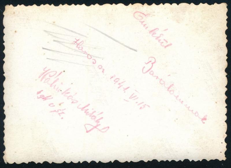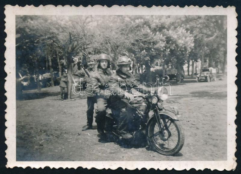 Leírás: 1941 A 4. gépkocsizó szakasz katonái motoron, háttérben autókkal, Hároson, Csepelen, fotó hátoldalon feliratozva, 6×8,5 cm