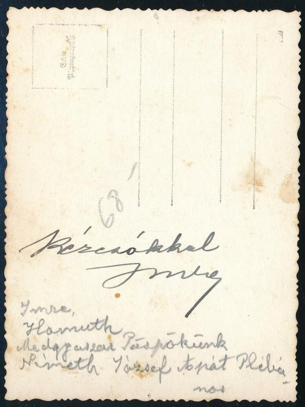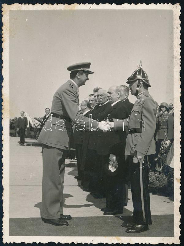 1942.05.25. Pápa, a Magyar Királyi ,,vitéz Bertalan Árpád" 1. Honvéd Ejtőernyős Zászlóalj csapatzászlójának avatási ünnepsége a pápai repülőtéren. Előtérben Horthy István kormányzóhelyettes kezet fog Hodik Imre rendőrkapitánnyal, mögötte Hamuth János Pápa város polgármestere, fotólap,11,5x9 cm