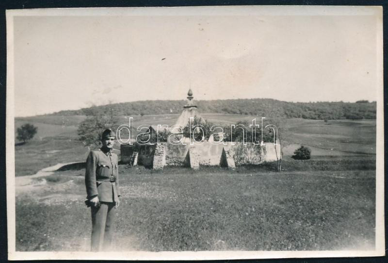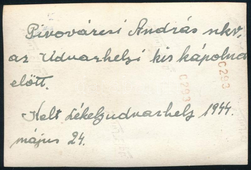 Leírás: 1944 Magyar szkv. a székelyudvarhelyi (Erdély) kis kápolna előtt, fotó hátoldalt részletes leírással, 5,5×8,5 cm