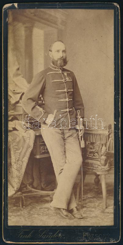 Leírás: cca 1890-1900 Katonatiszt kitüntetésekkel, szablyával, keményhátú kabinetfotó Fink Sándor pozsonyi műterméből, kissé sérült, foltos, 21x10 cm